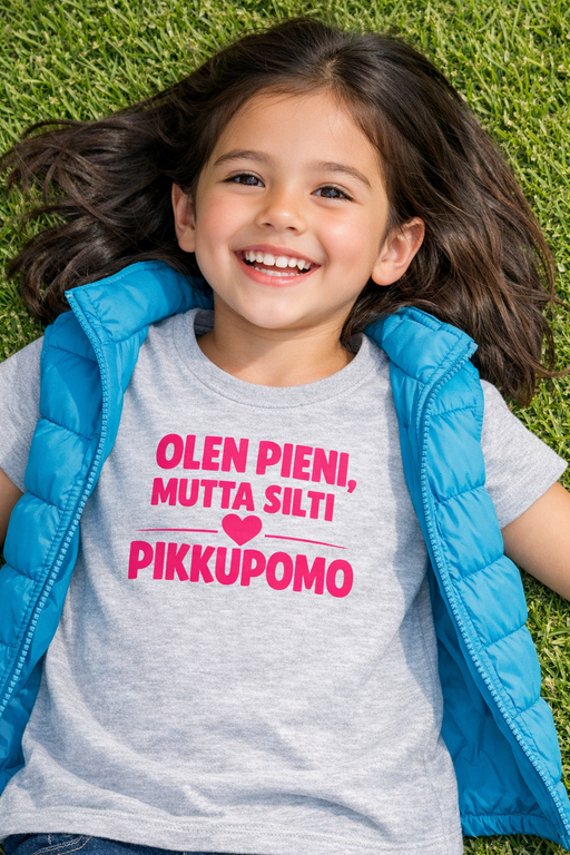 Kun PIKKUPOMO puhuu, myös pehmolelut kuuntelevat. Vaaleanharmaa paita ja pinkki teksti tekevät viestistä selkeän: pieni kyllä, mutta pomo silti. Mukava arkeen, leikkeihin ja kaikkiin hetkiin, kun säännöt sovitaan hymyssä suin.