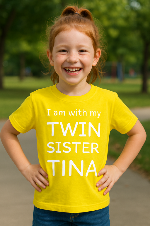 Tuplasti naurua, koska heitä on kaksi! 😄 Keltainen lasten T-paita printillä ’I am with my TWIN SISTER TINA’ kertoo heti, kuka on kenenkin tiimiä. Täydellinen kaksostytöille, synttäreille ja kuviin, jotka keräävät tykkäyksiä! 📸