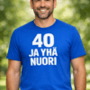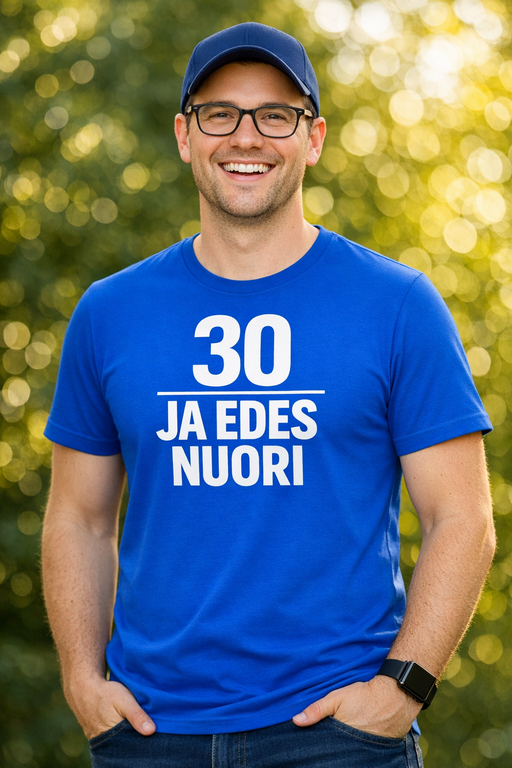 Kolmekymppisenäkin vielä edessä on nuoruus – ja tämä paita sanoo sen ääneen: 30 JA EDES NUORI. Kuningassininen väri ja iso valkoinen printti näkyvät kauas ja toimivat takuuvarmana keskustelunavauksena.