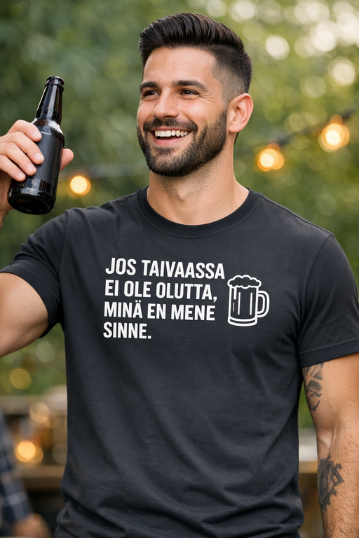 Taivas ilman olutta? Ei kiitos. Musta t-paita valkoisella tekstillä “JOS TAIVAASSA EI OLE OLUTTA, MINÄ EN MENE SINNE” ja tuoppi-ikonilla tekee kannanoton selväksi.