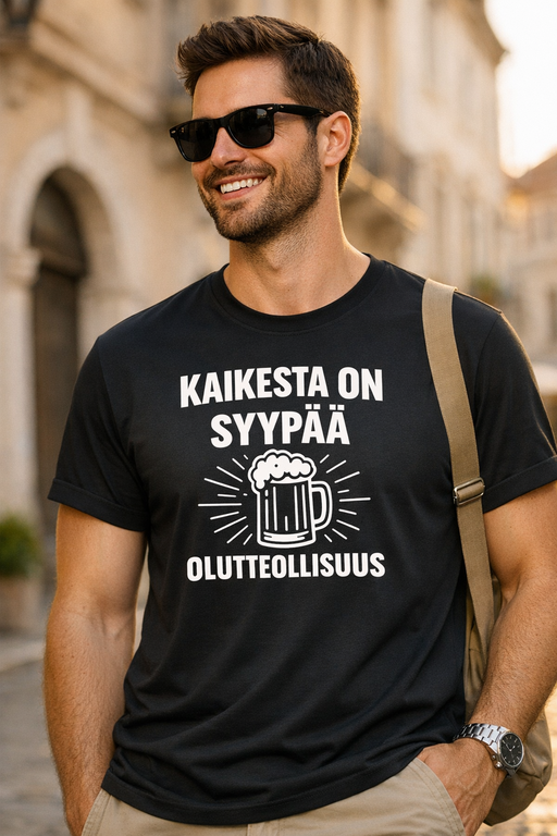 Kun joku kysyy kuka mokasi, riittää että osoitat paitaa: Kaikesta on syypää olutteollisuus. Valkoinen printti ja oluttuoppi keskellä tekevät vitsistä selkeän ja toimivan – perjantain aftereista sunnuntain grilliin.