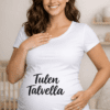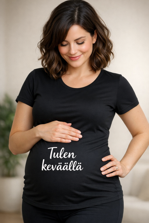 Kun luonto herää, myös teidän pieni pomo ilmoittaa tyylillä: Tulen keväällä. Musta äitiys-t-paita valkoisella printillä korostaa masua ja tuo hyvän mielen mukaan neuvolaan, brunssille ja arkeen.