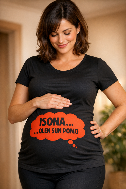 ISONA… OLEN SUN POMO kertoo kaiken: pieni tuleva pomo on jo matkalla. Musta äitiys-t-paita ajatuskuplalla kerää hymyt niin töissä, kahvilla kuin arjen “palavereissa” – ja tekee selväksi, kuka laatinee jatkossa aikataulut.