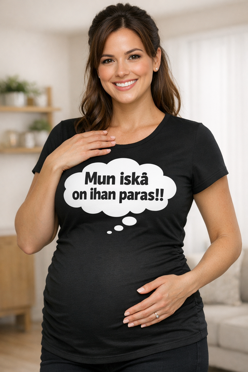 Musta äitiys-t-paita ja selkeä ajatuskupla tekevät viestistä heti ymmärrettävän: Mun iskä on ihan paras!! Täydellinen arkeen, kuviin ja siihen hetkeen kun haluat jakaa hyvän fiiliksen.