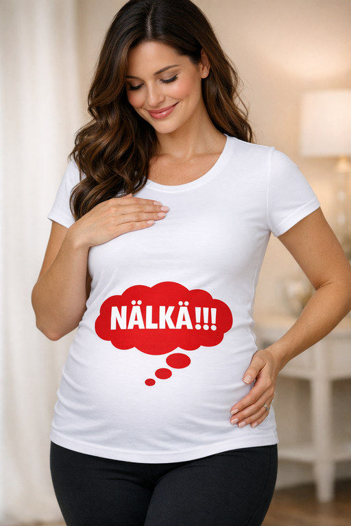 NÄLKÄ!!! kertoo kaiken yhdellä vilkaisulla – täydellinen, kun mieliteot iskee ja masuvauva määrää aikataulun. Punainen ajatuskupla valkoisella paidalla herättää hymyn kaupassa, kotona ja kahvipöydässä.