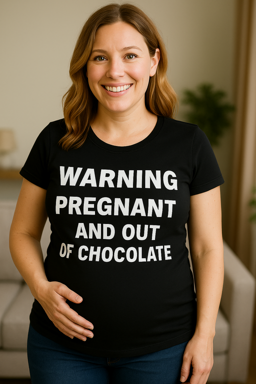 🚨 Suklaahälytys! Tämä äitiys T-paita, jossa lukee WARNING PREGNANT AND OUT OF CHOCOLATE, kertoo kaiken jo ennen kuin ehdit avata suusi. Kun himot iskevät, tämä on virallinen signaali välittömälle kaakaotoimitukselle. Kontrastinen valkoinen teksti mustalla paidalla varmistaa, ettei viesti jää huomaamatta—kotona, kaupassa tai ultrassa. Täydellinen päiviin, jolloin nauru on melkein yhtä tärkeää kuin suklaa.